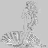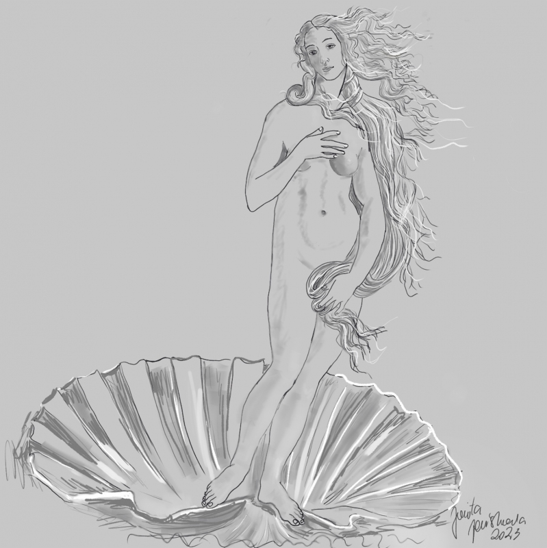 Bogini Miłości z obrazu Botticellego "Narodziny Wenus", narysowana na tablecie graficznym.